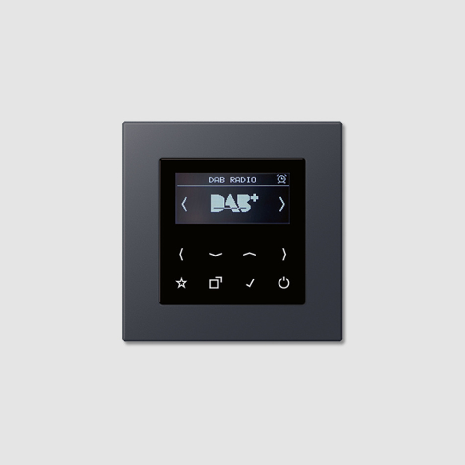 Einbauradio im Schalterdesign: Das JUNG Smart Radio DAB+ ist optisch und technisch ein Highlight. Es wird, wie ein Lichtschalter, ganz einfach in der Wand installiert – platzsparend und ohne lästiges Kabelgewirr im Raum. Das Smart Radio empfängt Programme über DAB+ sowie via UKW-Frequenz und speichert bis zu acht Sender pro Empfangsmodus. In der Variante mit Bluetooth lässt es sich außerdem mit Smartphone und Tablet koppeln. So streamen Sie die eigene Playlist oder Hörbücher, ohne erst nach dem passenden Sender suchen zu müssen. Bedient wird das Radio über ein elegantes Touchdisplay mit Glasfront. Erhältlich in den vielfältigen Rahmen im JUNG Design lässt es sich optimal an die übrige Elektroinstallation anpassen.