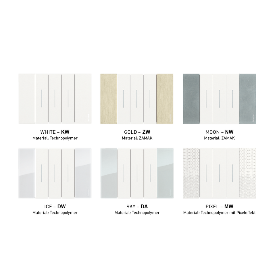 - 3 Farben für die Abdeckungen: Die Abdeckungen, wie z. B. Wippen und Steckdosenfrontblenden, sind in 3 verschiedenen Farben erhältlich: White, Sand und Black. Die satinierte Oberfläche sorgt für ein angenehmes Bediengefühl.