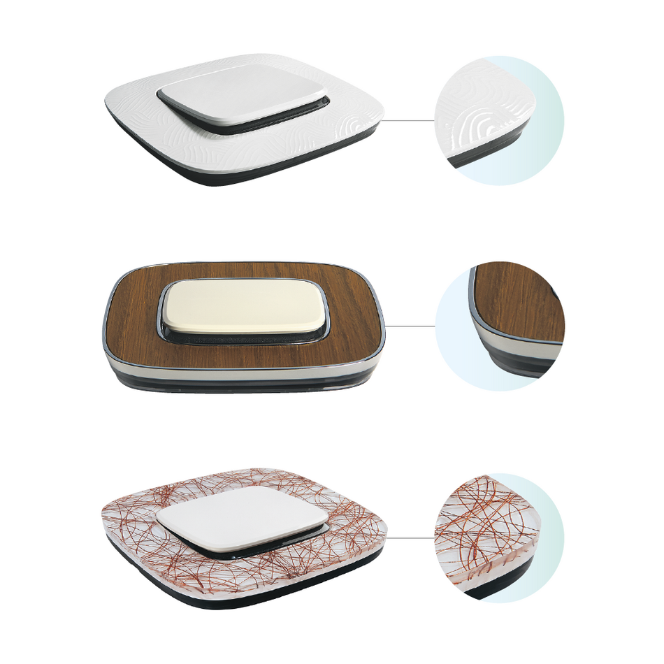 - Technopolymer: Die Abdeckrahmen aus Kunststoff werden in einem speziellen Verfahren gefertigt, das auch einen Tiefeneffekt in der Oberfläche gewährleistet.