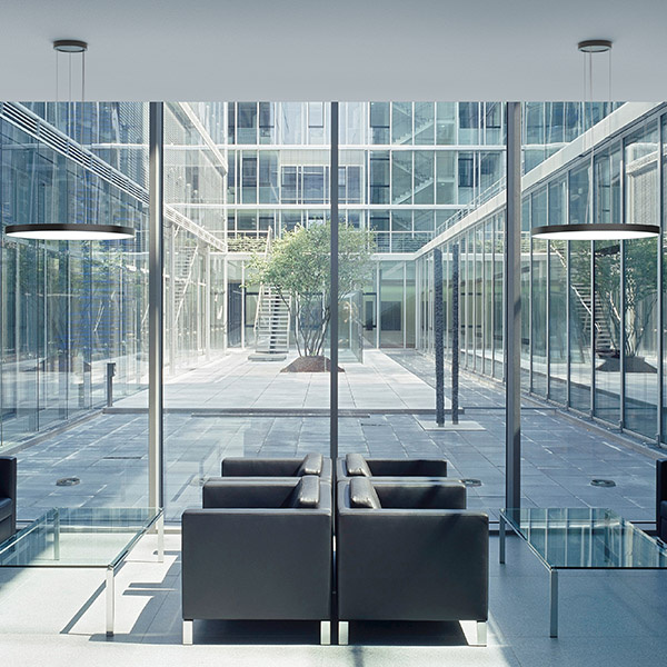 Verschiedene Diffusor-Ausführungen, darunter auch eine für Bildschirmarbeitsplätze geeignete, mikroprismatische Version mit UGR ≤ 19, erweitern TRIONA’s Einsatzmöglichkeiten zusätzlich. Die 680 Millimeter-Ausführung der Leuchte lässt sich alternativ sogar mit einer kunstvoll gefertigten FerroMurano-Glasscheibe veredeln und damit zum kostbaren Einzelstück machen.